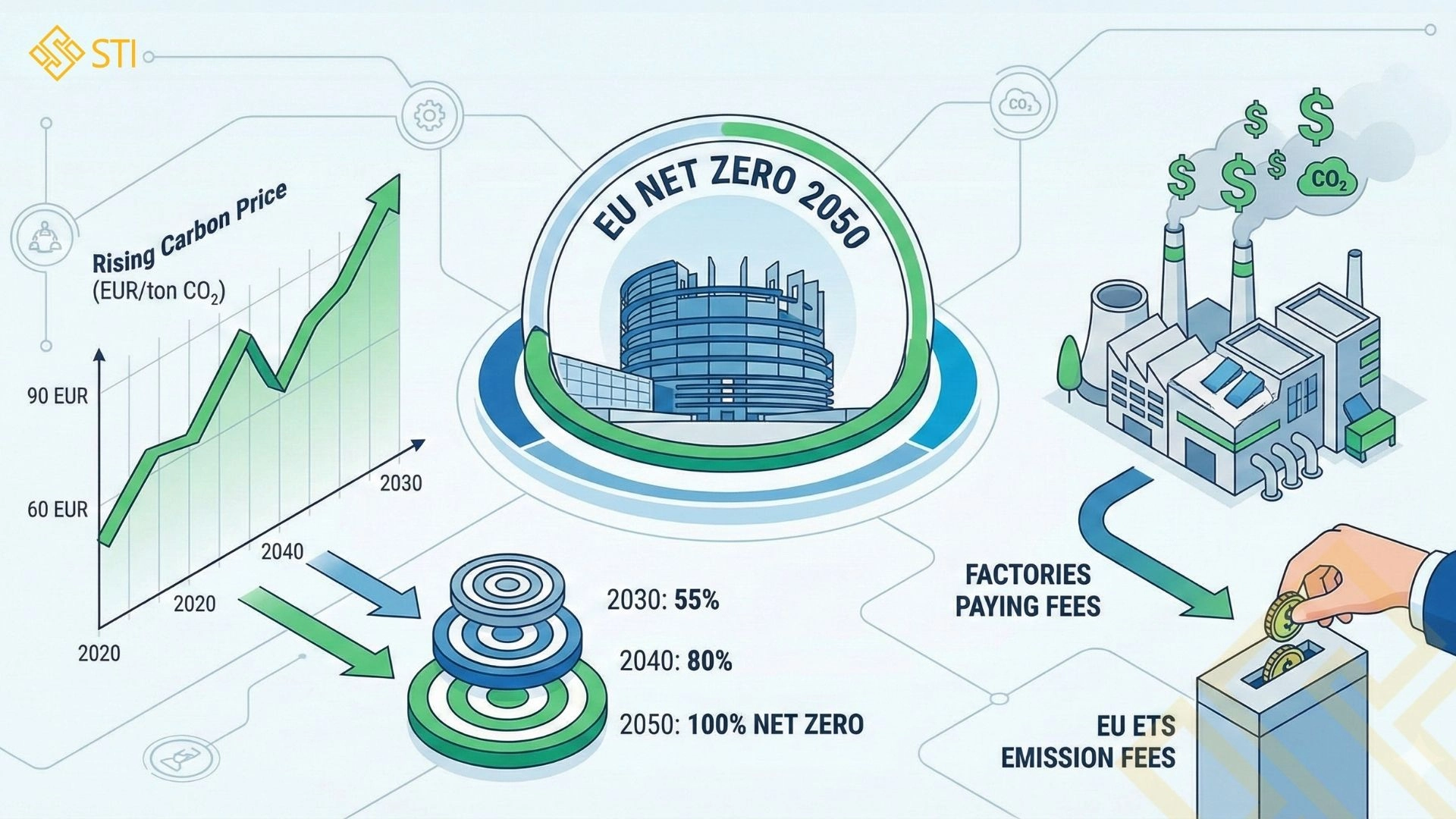 EU đặt mục tiêu đạt trung hòa carbon vào năm 2050 (Net Zero). Để tiến tới mục tiêu này, Liên minh châu Âu áp dụng EU ETS – Hệ thống Giao dịch Phát thải, yêu cầu mọi doanh nghiệp trong nội khối phải trả phí cho mỗi tấn CO₂ phát thải. Đây là công cụ khiến chi phí sản xuất “càng phát thải – càng đắt đỏ”.