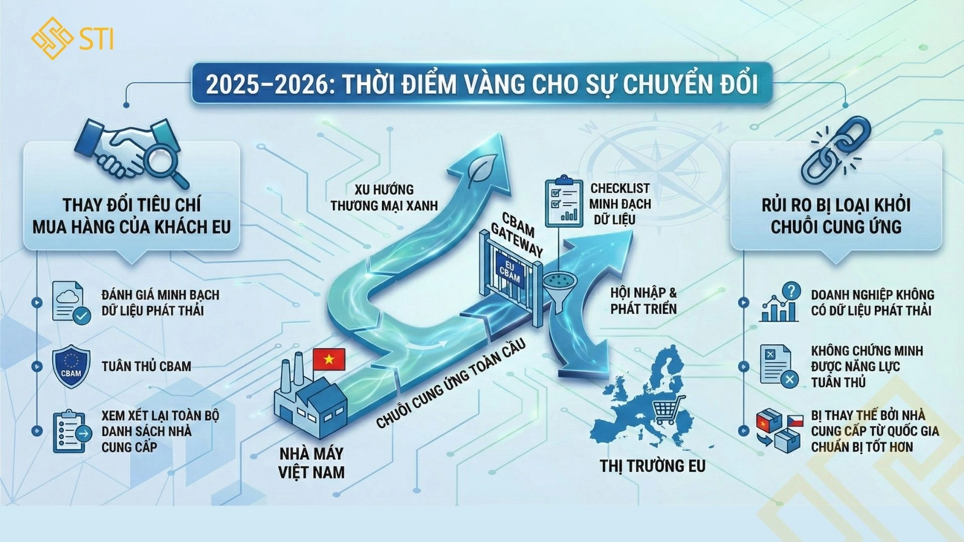 CBAM – Cơ chế điều chỉnh biên giới Carbon đang trở thành mối quan tâm hàng đầu với doanh nghiệp xuất khẩu EU. Đặc biệt, giai đoạn cuối 2025, đầu 2026 là giai đoạn chuyển dịch quan trọng từ “ báo cáo dữ liệu” sang “nghĩa vụ tài chính”, dữ liệu phát thải và khả năng tuân thủ sẽ ảnh hưởng trực tiếp đến chi phí và sức cạnh tranh của sản phẩm tại EU. Bài viết này cung cấp checklist cụ thể giúp doanh nghiệp SME Việt Nam chủ động nắm bắt cơ hội để xây dựng lộ trình ”xanh” đáp ứng yêu cầu khắt khe của thị trường EU.