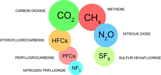 Theo Điều 91, Luật Bảo vệ môi trường 2020 số 72/2020/QH14, các khí nhà kính bao gồm carbon dioxide (CO2), methane (CH4) và nitrous oxide (N2O). Các khí có hàm lượng thấp nhưng có tiềm năng cao gây hiệu ứng nhà kính là hydrofluorocarbons (HFCS), perfluorocarbons (PFCS), sulphur hexafluoride (SF6) và nitrogen, trifluoride (NF3).